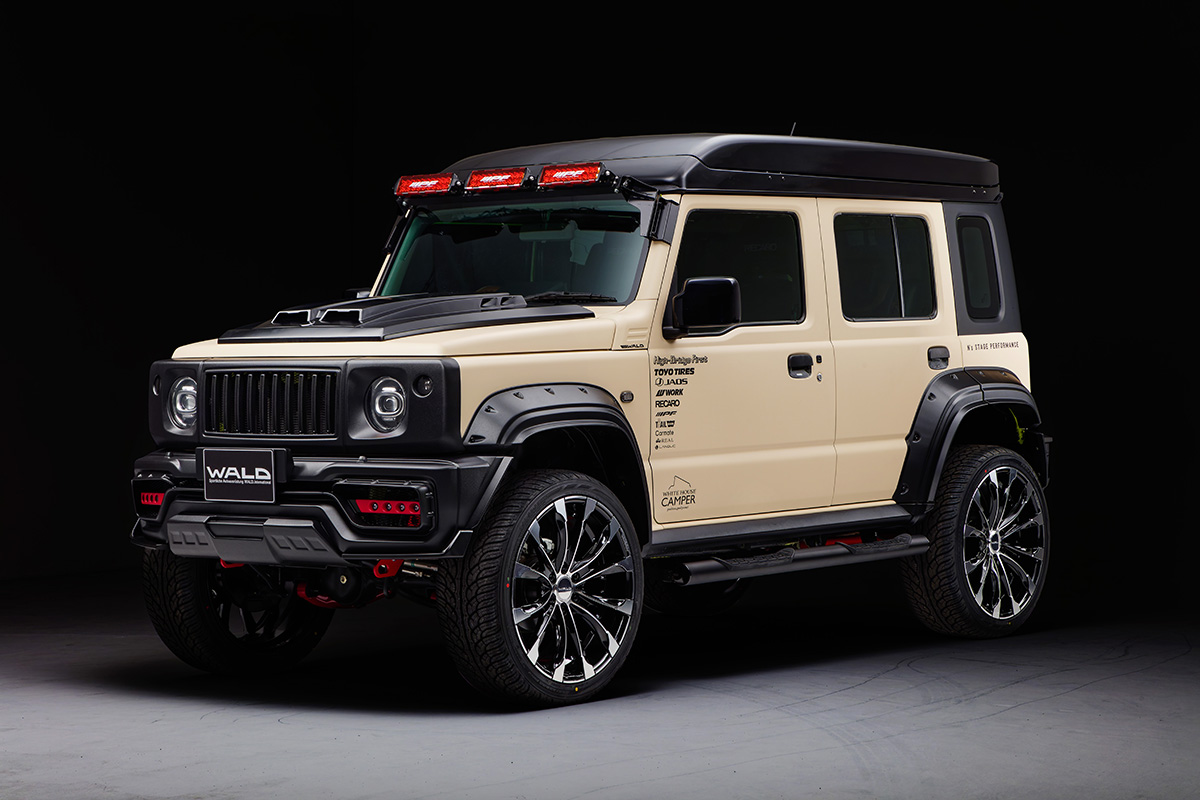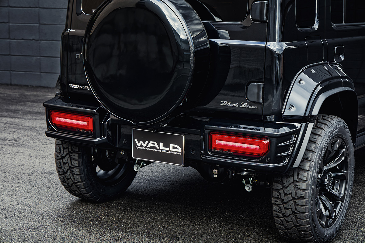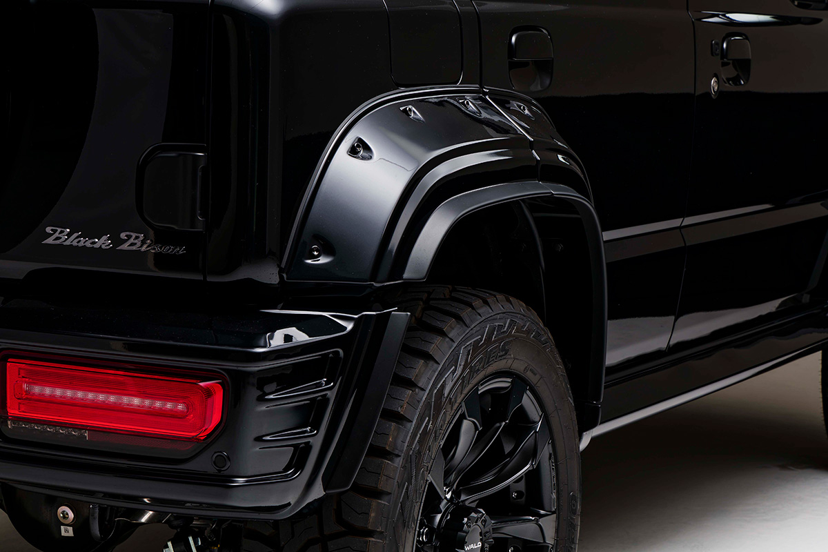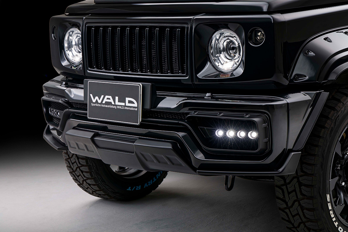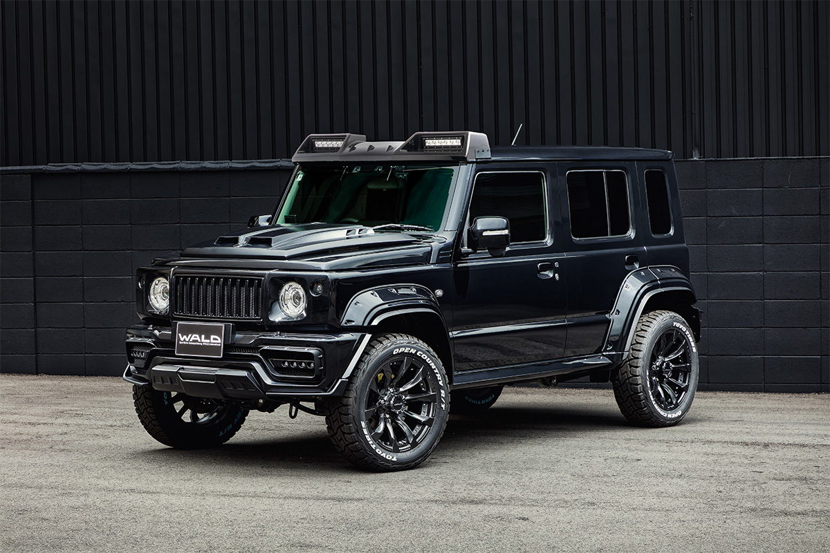 WALD gives a touch of BLACK BISON EDITION to the Big Demand Model, SUZUKI JIMNY, as known as the Light-Weight SUV in the market. To create the volume on the body and for the aggressive size wheels and tires, the sense of unity is given with the Front Bumper arranged 4PC LED Lamp Units, the Over Fenders and the Rear Bumper Panel for the Exterior Modification Basement. The Front Grille with Headlight Covers are designed as the 1 exterior part, and the Add-On Type Aero Bonnet transforms the Light-Weight SUV into the Aggressive Style 4WD Model. On the Roof Part, WALD developed the Roof LED Basement for Front and Rear Wing for the Rear End.