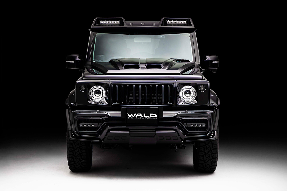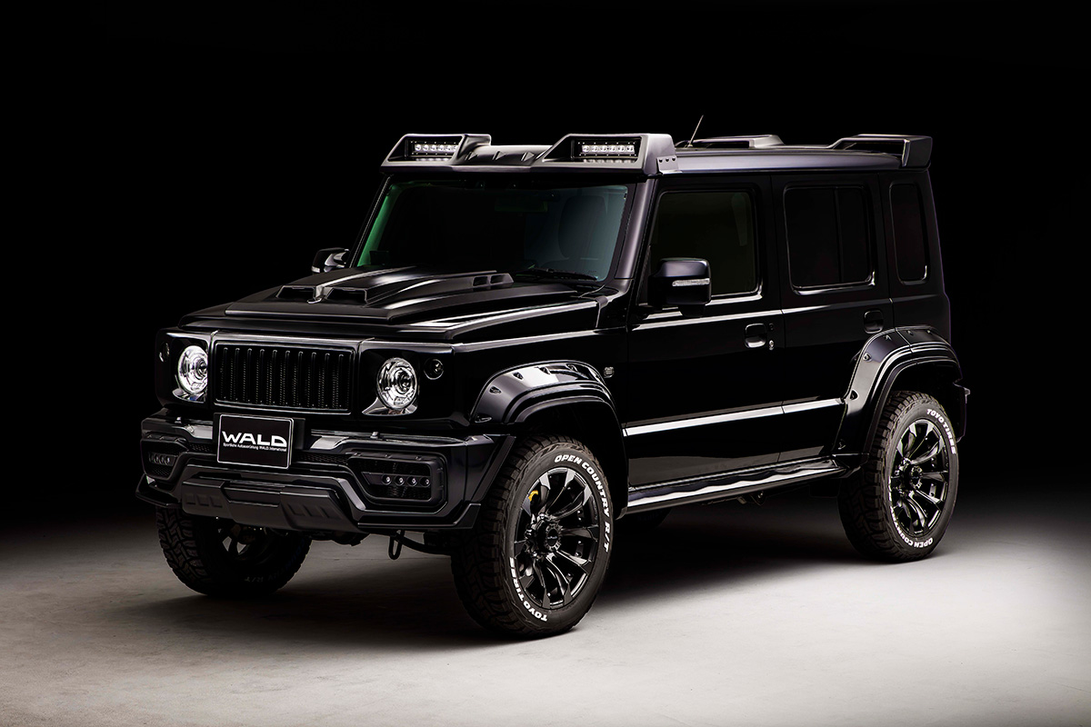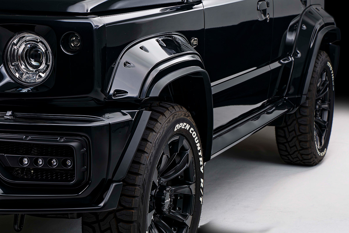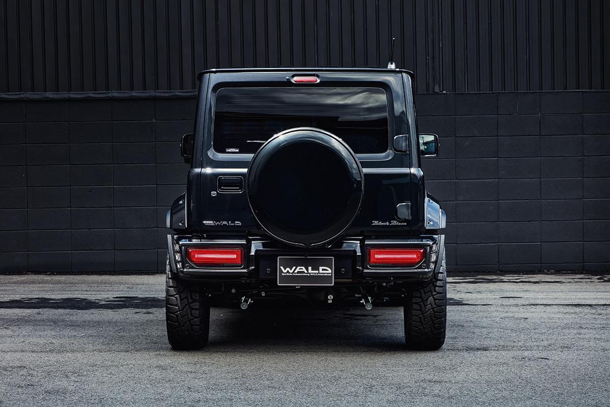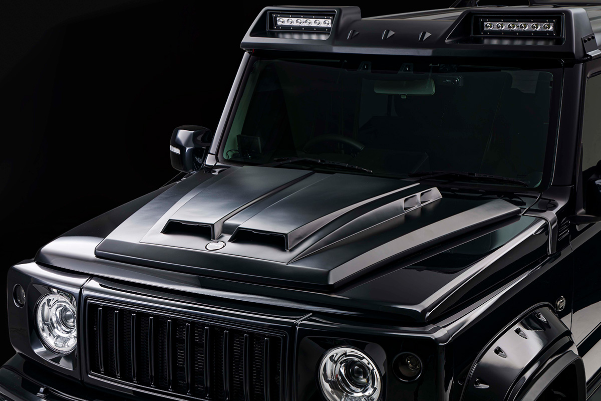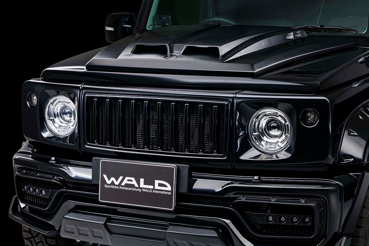 WALD gives a touch of BLACK BISON EDITION to the Big Demand Model, SUZUKI JIMNY, as known as the Light-Weight SUV in the market. To create the volume on the body and for the aggressive size wheels and tires, the sense of unity is given with the Front Bumper arranged 4PC LED Lamp Units, the Over Fenders and the Rear Bumper Panel for the Exterior Modification Basement. The Front Grille with Headlight Covers are designed as the 1 exterior part, and the Add-On Type Aero Bonnet transforms the Light-Weight SUV into the Aggressive Style 4WD Model. On the Roof Part, WALD developed the Roof LED Basement for Front and Rear Wing for the Rear End.