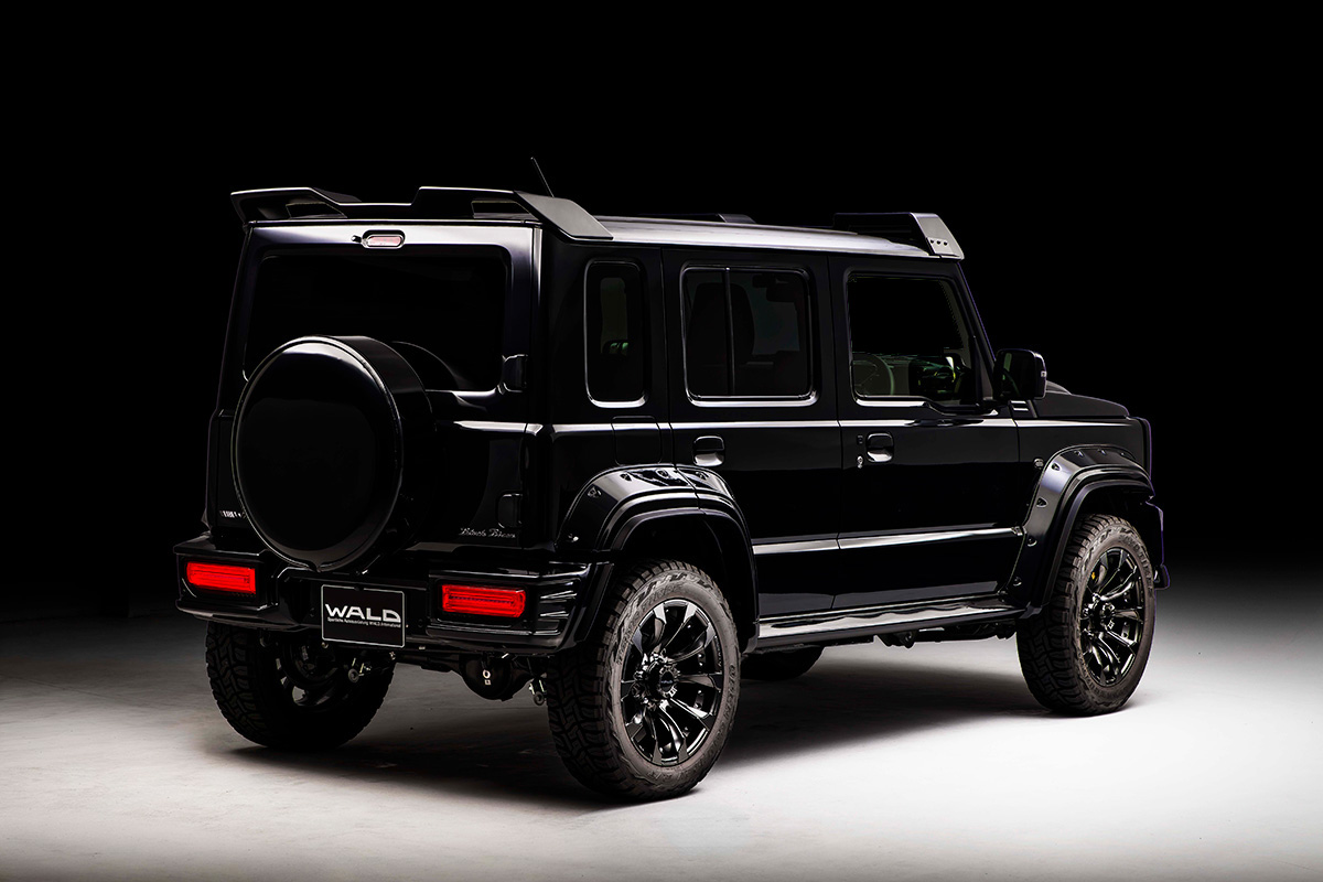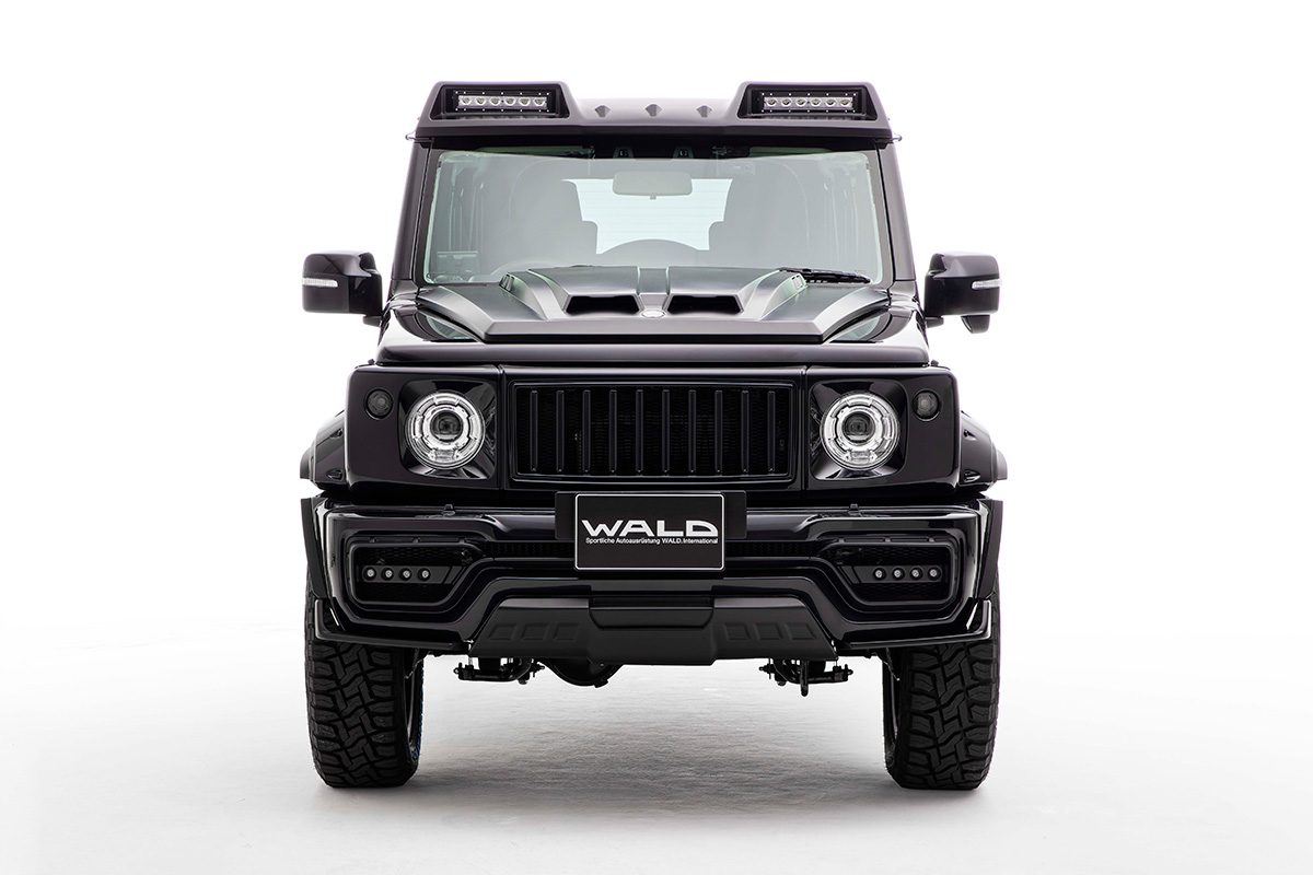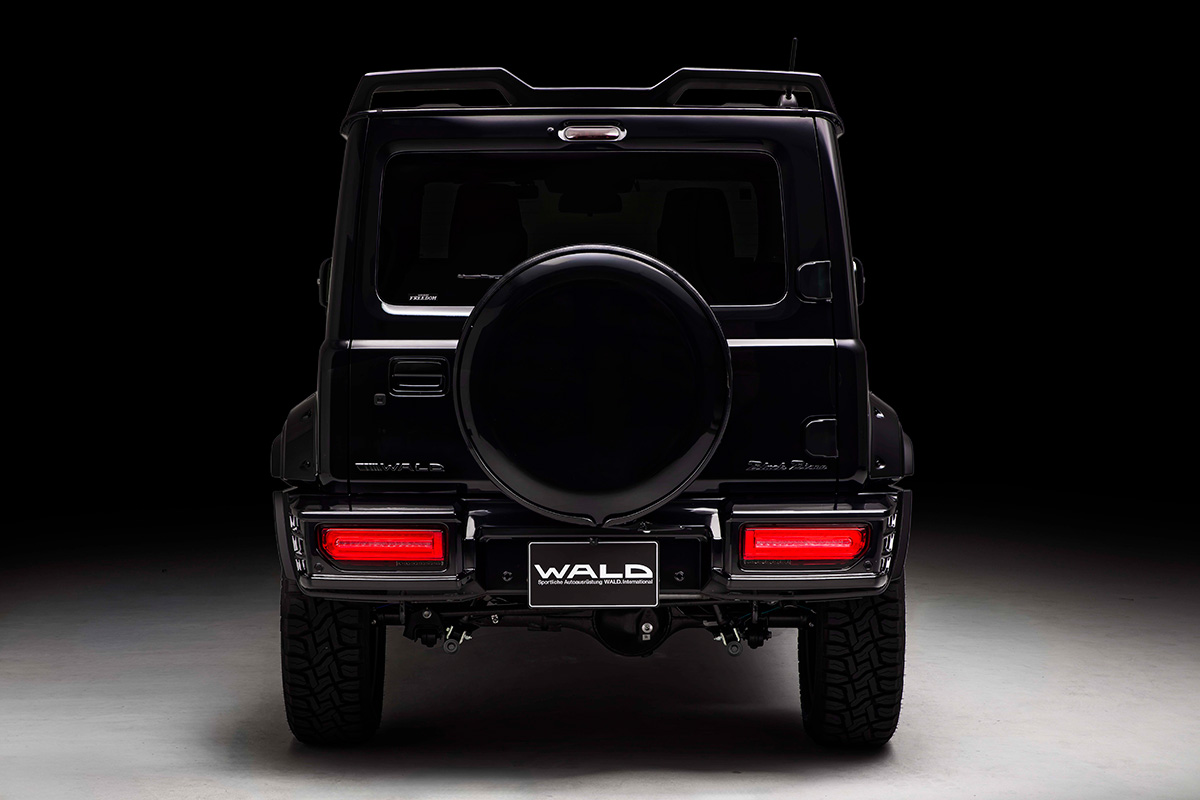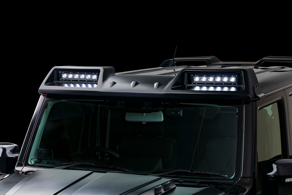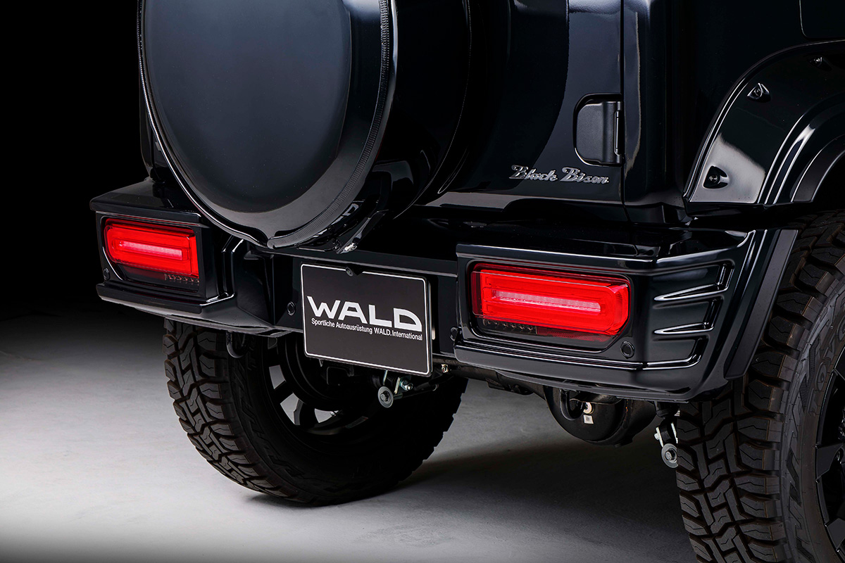 WALD gives a touch of BLACK BISON EDITION to the Big Demand Model, SUZUKI JIMNY, as known as the Light-Weight SUV in the market. To create the volume on the body and for the aggressive size wheels and tires, the sense of unity is given with the Front Bumper arranged 4PC LED Lamp Units, the Over Fenders and the Rear Bumper Panel for the Exterior Modification Basement. The Front Grille with Headlight Covers are designed as the 1 exterior part, and the Add-On Type Aero Bonnet transforms the Light-Weight SUV into the Aggressive Style 4WD Model. On the Roof Part, WALD developed the Roof LED Basement for Front and Rear Wing for the Rear End.