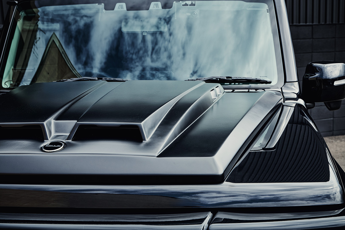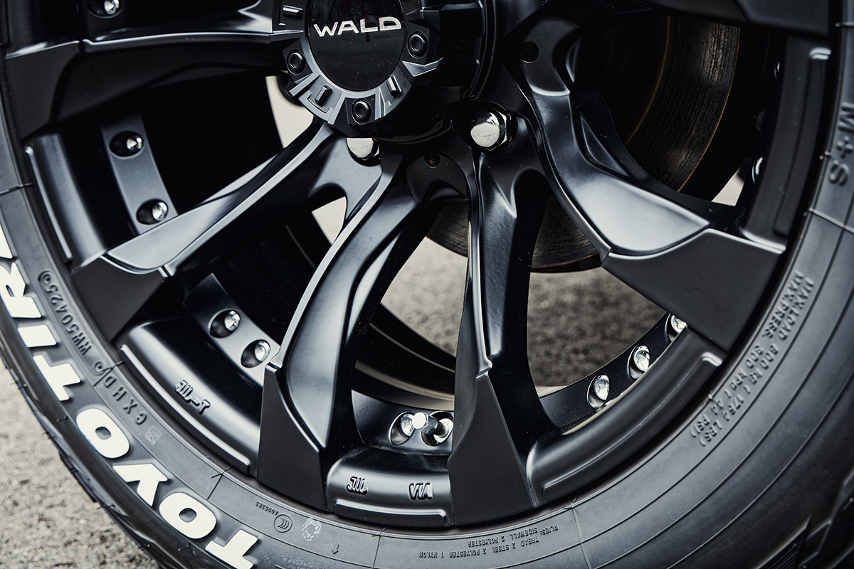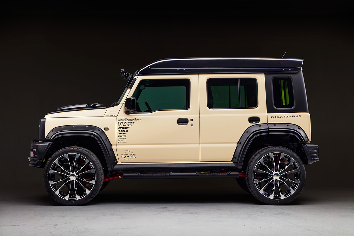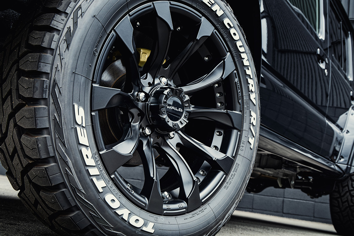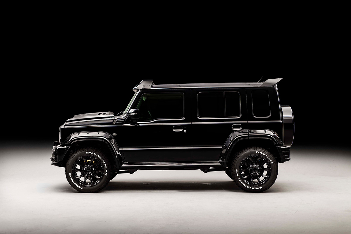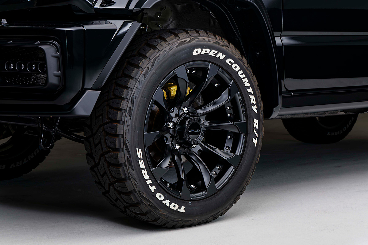 WALD gives a touch of BLACK BISON EDITION to the Big Demand Model, SUZUKI JIMNY, as known as the Light-Weight SUV in the market. To create the volume on the body and for the aggressive size wheels and tires, the sense of unity is given with the Front Bumper arranged 4PC LED Lamp Units, the Over Fenders and the Rear Bumper Panel for the Exterior Modification Basement. The Front Grille with Headlight Covers are designed as the 1 exterior part, and the Add-On Type Aero Bonnet transforms the Light-Weight SUV into the Aggressive Style 4WD Model. On the Roof Part, WALD developed the Roof LED Basement for Front and Rear Wing for the Rear End.